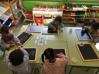 Avui els Peixos, ens hem dividit amb dos grups per conèixer l'ambient de llum i hem pogut jugar, manipular i pintar amb tots els materials. La resta hem fet un petit taller de composició lliure retallant i enganxant diferents papers.