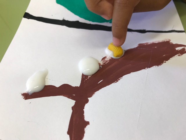 Primer vam pintar l'arrós i la pasta, després, amb una esponja vam estampar unes fulles i vam fer unes branques d'arbre, i finalment vam enganxar l'arrós que representen els ous, i la pasta que simula els cucs, els capolls i les papallones.